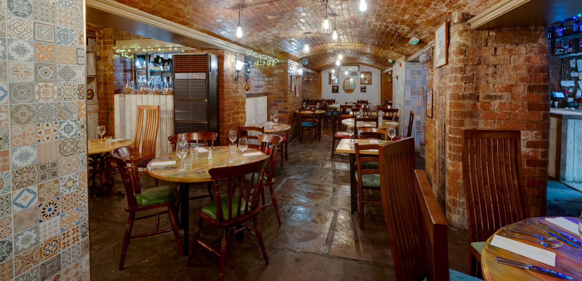 The stairs to the left of the entrance leads down to the cellar – where you will find seating for 100+ guests – designed to transport you to the renowned vineyards Italy is famous for. Opening into an impressive flexible space, including intimate dining areas, the Mediterranean inspired tiling, red brick construction and rustic floors have to be seen to be believed.